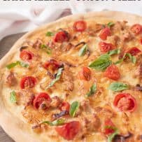 A yeast free pizza dough topped with mozzarella, cherry tomatoes, Italian sausage and caramelized onions.