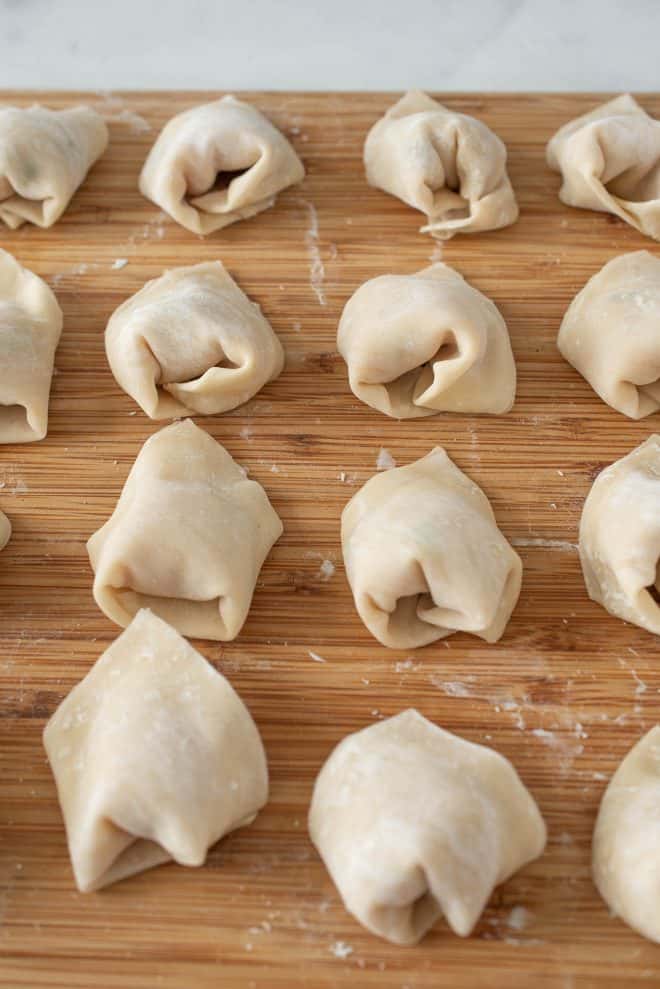 - With the folded corner facing away from you, bring the left and right corners around to meet at the bottom, wet with water and press firmly together. You can see this in the pictures and also in the video. Set aside. Don’t worry too much about the shape as they change dramatically when cooked.