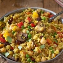 Curry Vegetable Quinoa is an easy veggie and protein loaded light lunch or side dish. With curry spices cooked with the quinoa for maximum flavor, this nutrient-packed dish is vegan and gluten-free. A colorful dish with with mushrooms, bell pepper, carrots and peas, a sweet bite from raisins and a nutty bite from toasted almonds. Extra protein also comes from toasted almonds and chickpeas/garbanzo beans.
