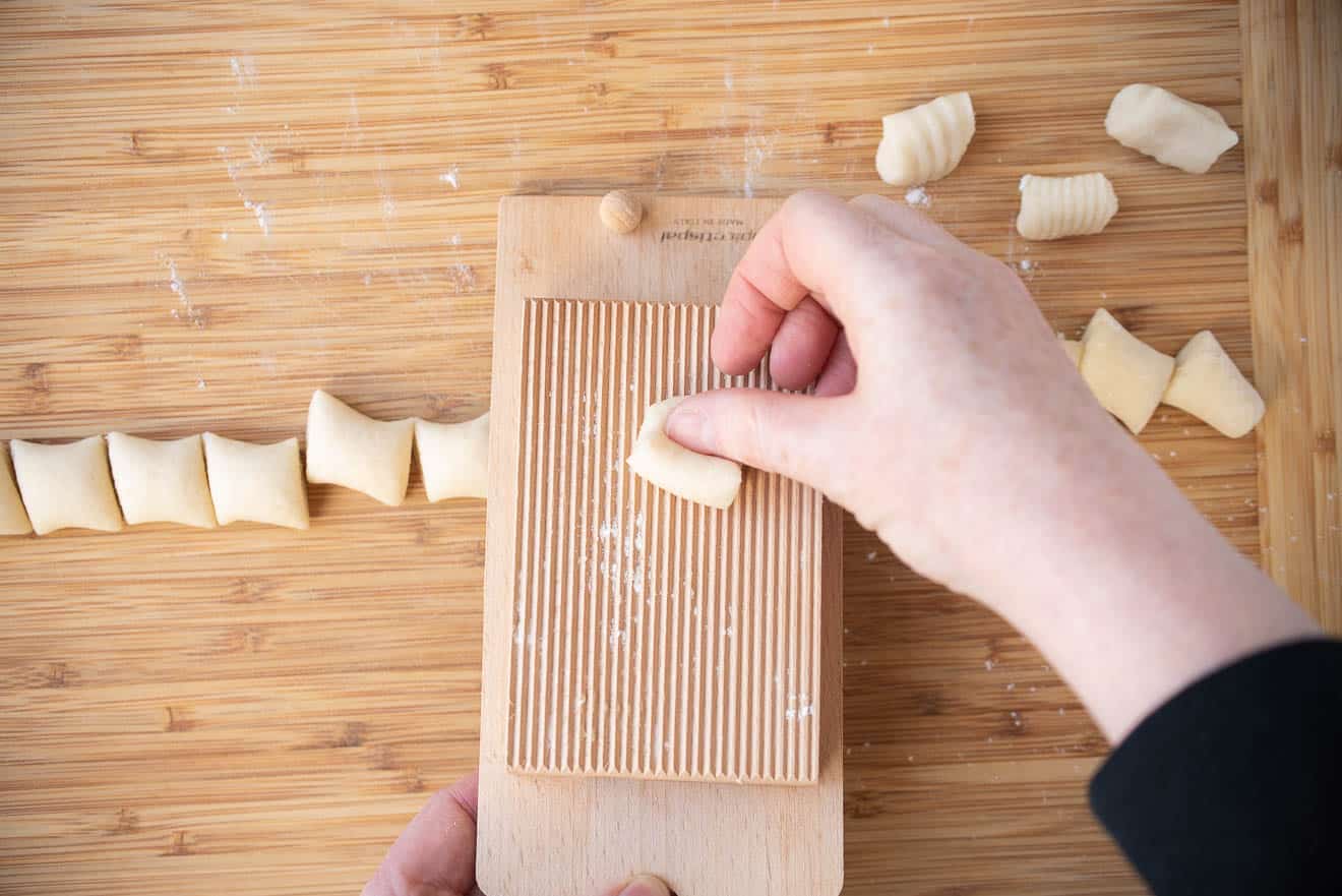 Ever wonder how to get those ridges? Rolling the gnocchi over a gnocchi paddle/gnocchi board or the back of a fork is the way to create the ridges. The ridges are an important element of gnocchi, helping sauce stick to them. You can see the entire process in the attached video.