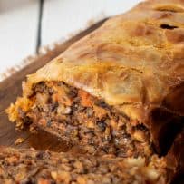 Savory mushrooms, vegetables and herbs are shaped into a loaf, wrapped in flaky puff pastry and baked until golden brown. Vegetarian Mushroom Wellington with Gravy is a delicious vegetarian Wellington option. Meat eaters, you will not miss the meat, I promise.