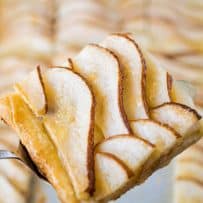 Easy Pear Tart is an easy, delicious and impressive dessert that is perfect for family dinners or a holiday dessert. Juicy sliced pears are fanned onto flaky pastry, baked until golden brown, then brushed with pear preserves for a delicious glossy sheen.