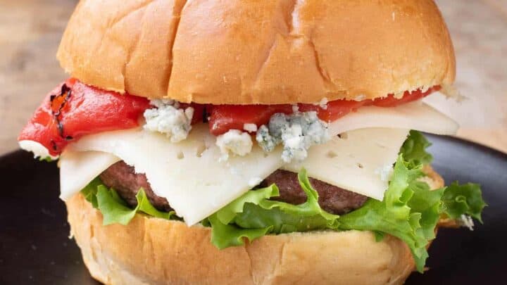 A juicy grilled beef burger topped with roasted red pepper, white and blue cheeses.
