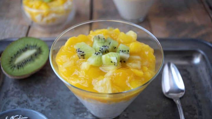 A creamy and comforting summer dessert topped with tropical mango, pineapple and kiwi.