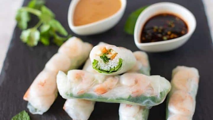 Fresh shrimp, lettuce, carrots, cucumber, rice noodles and herbs are wrapped in rice paper.
